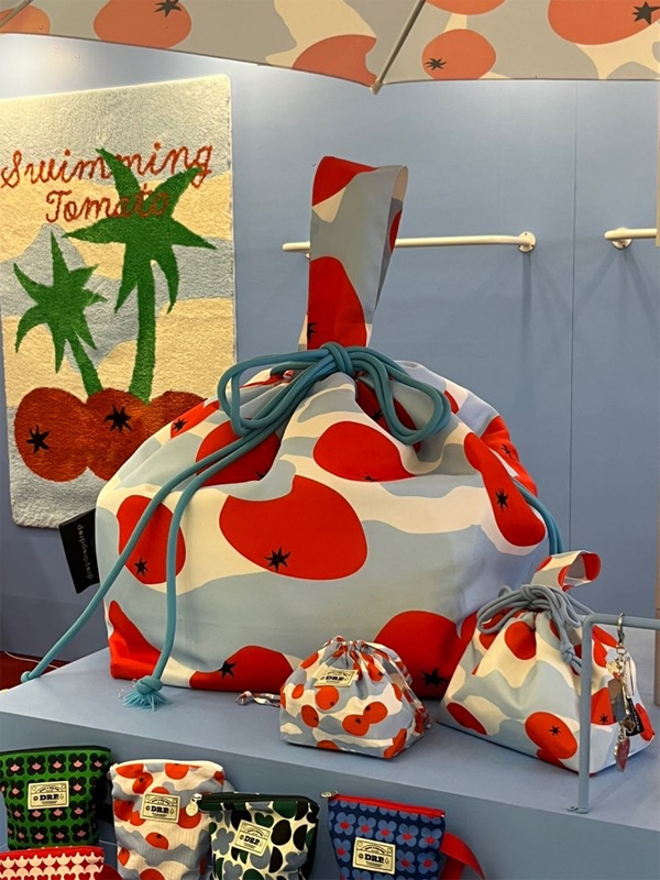 dropdropdrop의 가장 큰 특징은 강렬한 색상 조합입니다. 빨강, 파랑, 노랑, 초록 같은 원색이 주를 이루고, 여기에 블랙과 화이트가 포인트로 들어갑니다. 대표적인 ‘토마토 패턴’은 단순하면서도 직관적인 비주얼 덕분에 소비자들의 시선을 단번에 사로잡습니다. 실제로 전시 부스는 멀리서도 눈에 띄며, 소비자에게 “이 브랜드는 개성 있고 즐겁다”라는 인상을 강하게 남깁니다. 이는 곧 충동구매를 유도하는 색채 전략으로 이어집니다.