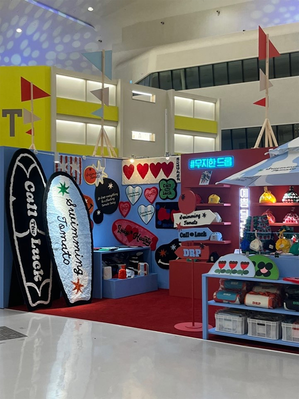 dropdropdrop의 가장 큰 특징은 강렬한 색상 조합입니다. 빨강, 파랑, 노랑, 초록 같은 원색이 주를 이루고, 여기에 블랙과 화이트가 포인트로 들어갑니다. 대표적인 ‘토마토 패턴’은 단순하면서도 직관적인 비주얼 덕분에 소비자들의 시선을 단번에 사로잡습니다. 실제로 전시 부스는 멀리서도 눈에 띄며, 소비자에게 “이 브랜드는 개성 있고 즐겁다”라는 인상을 강하게 남깁니다.